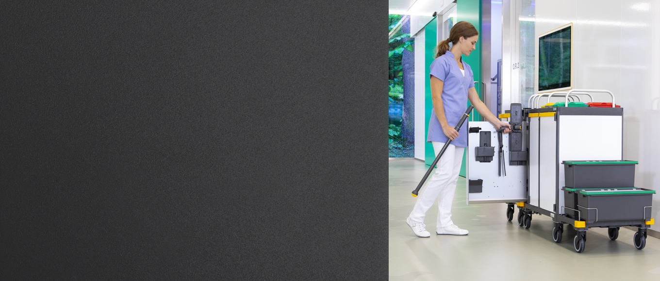 Storing the equipment in this way ensures the trolley looks neat and tidy. And because the handle and its equipment are not left hanging on the outside of the trolley, there is less risk of damage. The Scandic X system from VERMOP eliminates the hassle of managing multiple handles. It is compatible with VERMOP accessories and equipment from all major manufacturers – a truly unique feature.